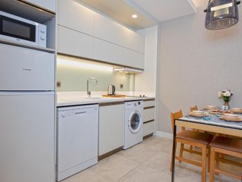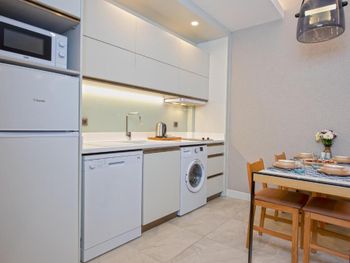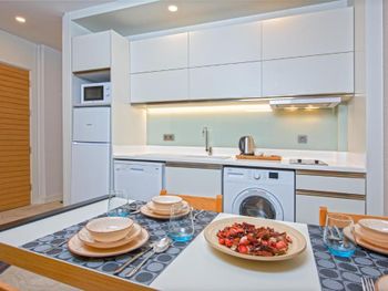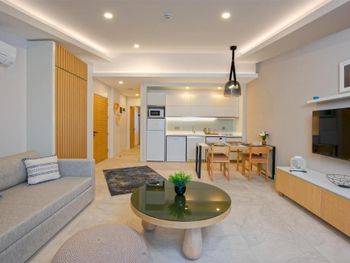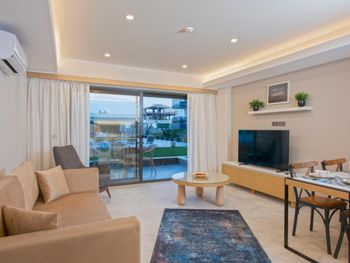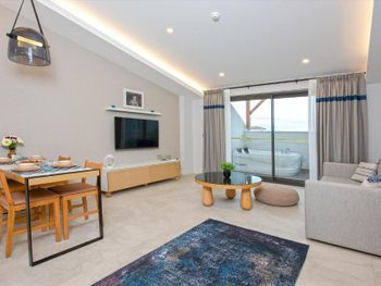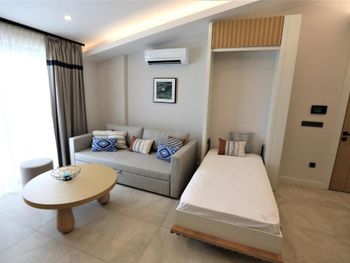 Современные большие апартаменты, уютная территория, близко к центру, вокруг много кафе и ресторанов, магазинов и киосков, хороший пляж до которого можно дойти пешком.
