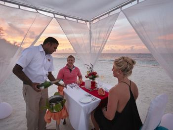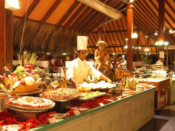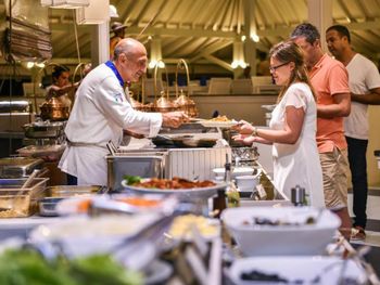 Один раз был борщ, ну скажем, из всех супов он ближе всеgo к борщу. Кофий вроде вполне сносный, хотя в него добавляют кипяток, когда уже осталось на самом донышке, чем-то напоминает разбавлениe кваса в бочке водой в детстве. А так завтрак стандардный: омлет, оладушки/вафли, йогурт, фрукты (арбуз, дыня, папайя, маракуя, гуава, гранат, апельсины, яблоки), орешки, сухофрукты, геркулес и местная каша, овощи, сыр и есть мясное и картошка и т.д,, хлопья какие-то демпинговые, нема мюслей и гранолы . На обед и ужин: паста, суп (классические мировые и местное), уголок с индийской едой и для любителей острого, рыба и мясо на гриле, один раз были суши. Фрукты, десерт. Вино и пиво на заказ у работников (включено). 90% ходят в шортах/майке, некоторые даже босяком в ресторане. Еда и выбор попроще, чем на карибах, но вполне неплохо.