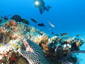 Имеется экскурсия Submarine Dive на пассажирской подлодке, 150 USD с человека, ехать на катере до неё долго, минут 40, погружение на минут 50 к мертвому рифу, из которых рыбок посмотреть минут 20, кажется того не стоит.