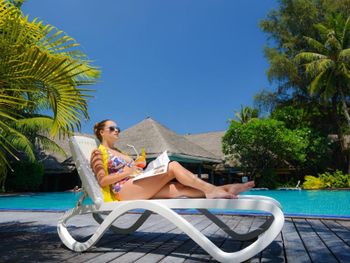 Очень большая проблема с лежаками. Они общие, и с утра их уже занимают. Многие ставят их себе на террасу и персонал их не убирает оттуда. Не понимаю почему нельзя к каждой вилле привязать по два лежака и еще оставить общие.