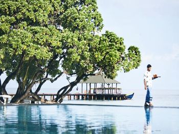 чистое море без травы и мусора ресторан возле вилл на воде.