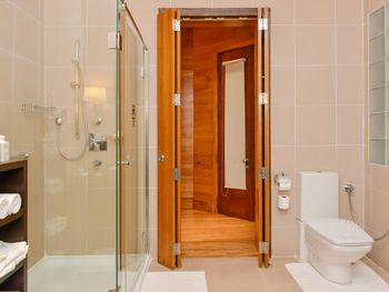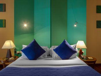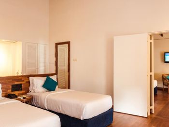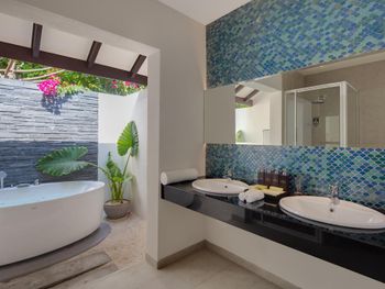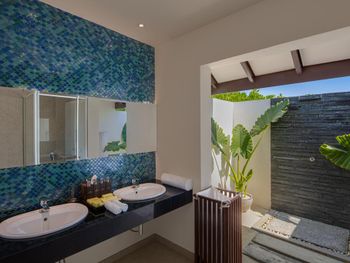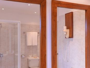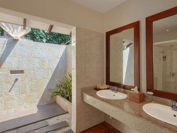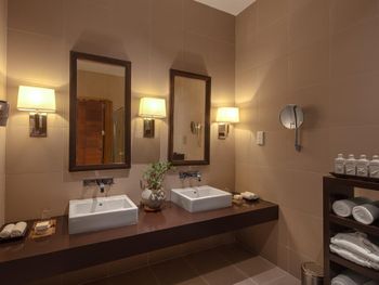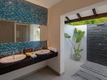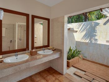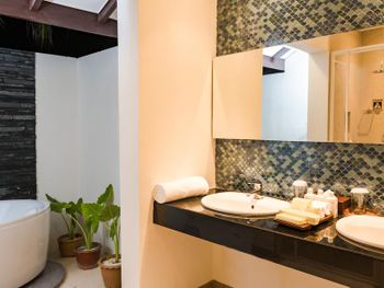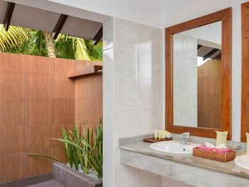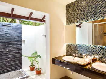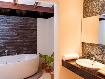 Ванные комнаты отремонтированы плохо, отбитая Плитка , сантехника старая, бегает, ползает и летает разная живность, так как частично без крышы. Не все могут спокойно к этому относится. Очень часто эта живность оказывается в спальне , что совсем не приятно. Персонал не раз обрабатывал, но их обработка не помогала, совсем. Ещё не приятный момент: дорожки в отели просто грунтовые и постоянно пыль, от проезжающих быстро электрокаров и подминающих листву работников. Обувь была всегда грязной.