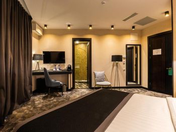 Номера очень странные. Очень странная геометрия номера и неудобно в номере: постоянно билась ногой об кровать, наступала на штору. Не хватало тапочек в номере. Не было ресторана. На кухне нельзя ни еду подогреть ничего взять. Уборка в течение дня- вечера отсутствует. Грязная посуда стоит в коридоре целый день. Нет лифта чтобы занести чемодан на входе. В ванной довольно темно. Матовые стеклянные двери в ванную…