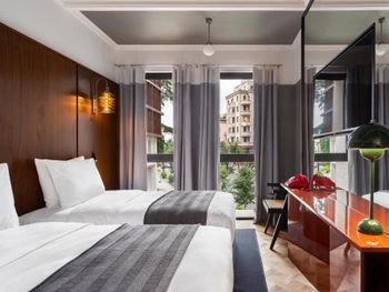 Модный отель, с интересными дизайнерскими решениями, хорошие завтраки.