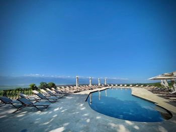 Очень маленький бассейн, вода очень холодная в начале августа, не прогревается от солнца, нет подогрева. Очень маленькая не уютная площадка перед бассейном, мало места, шезлонги стоят впритык (а не как на фото). Народу очень много, отель большой.