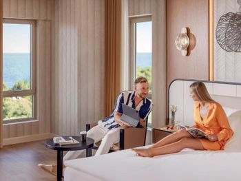 Понравилось море, горы, и много зелени на территории отеля. Большой по размерам номер у нас был двухэтажный. Персонал в ресторане основном с юмором, все такие замечательные - спасибо! Чай такой вкусный чай!!