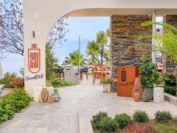 Пляж бетонный, но очень удобный и продуманный: спускаешься по настилу прямо в море, комфортно, чисто. Можно спуститься на лифте прямо к скалистому берегу, который украшен цветущими суккулентами — выглядит как ботанический сад. Атмосфера — как в арт-фильме: тёплая, светлая, очень красивая.
