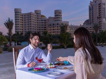 The spacious rooms and suites that range from 50-346 square meters offer stunning sea views of the Arabian Gulf or the golf course, each adorned with modern elegant décor and equipped with complimentary Wi-Fi, a flat-screen TV, mini-bar, and a spacious living area for added comfort.