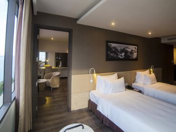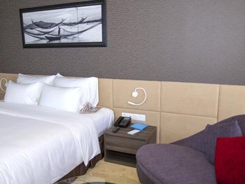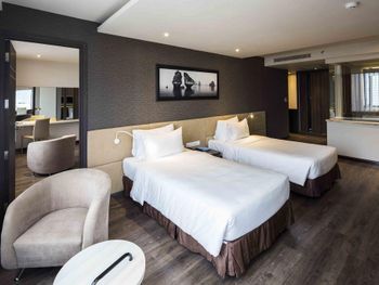 Мы с мужем и сыном брали трехместный улучшенный номер с большой кроватью (по факту две сдвинутые) и отдельной (простая докатка с деревяшкой в изголовье, не дающая возможности кровати вплотную встать к стене и облокотить подушки на мягкое изголовье). Холодильник едва ли холодит - гелевую маску для глаз использовать не удалось :( Ванная комната с очень тусклым освещением, зеркало практически не дает подсветки - девушки меня поймут. При заезде ~ в 16-17 часов одна из двух тусклых лампочек не горела. Самой ванной и душем можно пользоваться только сидя, иначе вода попадает на бортики и заливает весь пол. Ванну или не мыли или мыли плохо, т.к. неделю изо дня в день сохранялись следы грязных после пляжа ног. Было сломано ведро, не открывалось нажатием на педаль. Не докладывались по-крайней мере несколько дней ватные палочки. Самое неприятное - нерегулируемая температура воды в душе. Как ни крути ручку вода попеременно то кипяток, то довольно прохладная. Когда пожаловались, сотрудники отеля лишь сказали, что проверили и так происходит во всех номерах, мол, так работает бойлер. Мучались все две недели. Сдавали в прачку вещи и в первый раз забрали утром, вернули вечером, последующие разы понадобилось несколько раз напомнить, чтобы получить вещи обратно. Один раз заказали еду в номер, то, что сложно испортить, минибургеры, булочки были как сухари😶 На завтраки лучше приходить раньше, т.к. то, что заканчивается добавляется или очень неспешно или не добавляется вовсе. В целом нормальные завтраки, но на второй недели уже надоедают. Переслащен йогурт, частенько подают зеленые помидоры. ВНИМАНИЕ, в отеле действует система ваучеров на пляж с ограничениями. То есть получаешь под роспись полотенца и ваучер на три часа и идешь получать лежаки на пляж. В течение двух недель неоднократно не хватало лежаков даже с ваучером. На пляже предлагали вместо них кресла. И лежаки, и кресла - рухлядь. Последний день не хватило ваучера - 8 лежаков отеля уже были заняты😕