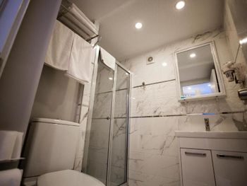 В ванной комнате только одна маленькая полочка, и то там помещаются только полотенца. Не очень новая сантехника, слабый напор в унитазе. Но самая большая проблема была принудительная вытяжка, которая шумела вплоть до 23 часов, что мешало спать даже при закрытой двери в ванную. Полотенца и постель за 4 дня ни разу не меняли. Их только складывали в рулончики на кровати, отчего создавалось впечатление, будто их сменили.