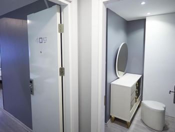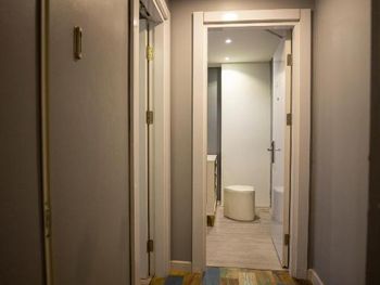 В коридоре не было ни крючка, ни лавочки, ни полочки. Свет только в одной части номера и больше ничего нет: ни ночников, ни другого света. Телевизор висит очень низко, если идти мимо, можно задеть экран.