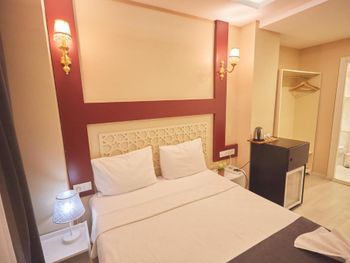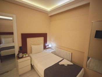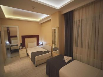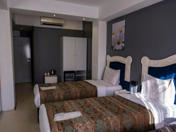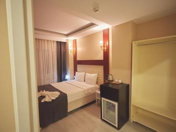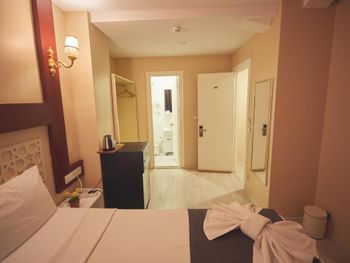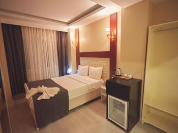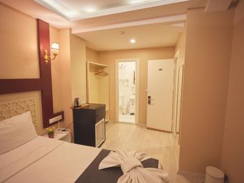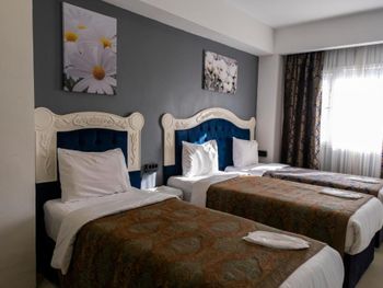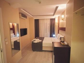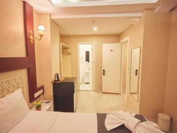 Приехали поздно ночью. Уже на улице нас ожидал молодой турецкий администратор отеля, который помог с чемоданами, быстро нас заселил и проводил до комнаты. Он же нас потом и провожал ранним утром. Другие сотрудники отеля также любезно помогали и отвечали на наши вопросы. Отель хоть и находится в центре, но шума ночью нет. Соседей вообще не слышали и не видели. Кому то завтрак покажется слабоватым. Но мы голодными не остались. Есть и соленое, и сладкое. Постельное белье и полотенца для этого отеля вполне отличные. Кровать, подушки удобные. По приезду в холодильнике были 2 маленьких бутылки воды. Остальное время воду докупали сами.