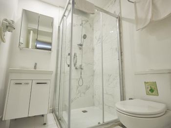 Тяжелый стеклянные двери в ванную комнату, и стеклянные стены в ванной.