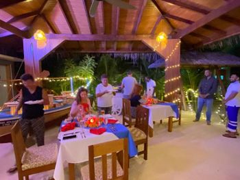 Отель очень удобный, чистый и комфортный. Оазис цивилизации на локальном острове 😁 Персонал восхитительный, всегда с улыбками и позитивом. Кроме отеля покушать на острове негде, поэтому не заморачивались и брали себе ужины в отеле. Был у нас один человек, который не ест грибы, рыбу и морепродукты, но даже к нему кухня нашла подход. Вокруг острова много собственных кораллов, первые пару дней изучали их. Маски и ласты предоставлял отель без дополнительной оплаты. Sup board тоже любезно нам предоставили. Перечень возможных экскурсий, не даст быстро заскучать от однообразия бикини пляжа. После рыбалки всю пойманную рыбу нам приготовили на ужин, очень вкусно и красиво. В один из вечеров, специально для нас четверых, организовали музыкальный вечер. С живой музыкой и местнымхором. Здорово наплясались и немножко познакомились с культурой местных жителей.