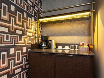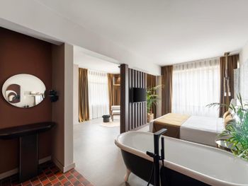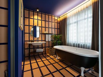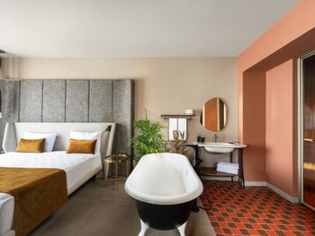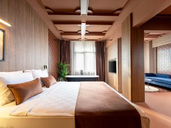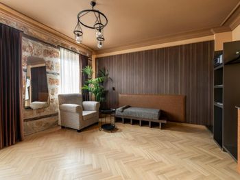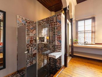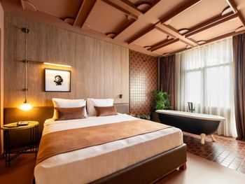В номере современный стильный ремонт, при этом сохранен колорит старого города. Номер очень просторный. Большая кровать, красивый буфет с холодильником и чайником. Отличная ванная комната.