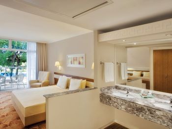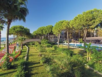 Шикарный отель! Превосходная огороженная территория, утопающая в зелени. Собственный большой пляж, парковая зона, всевозможные бары и кафе на территории, зоны отдыха на любой вкус. В отеле приветливый персонал, шикарная разнообразная еда на любой вкус, развлечения на любой возраст, по вечерам - не дешевая анимация, а полноценные концерты и шоу-программы. Находиться в отеле было сплошным удовольствием, машиной практически не пользовались, так как не хотелось уезжать. Отдыхать было крайне комфортно.