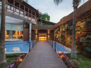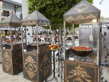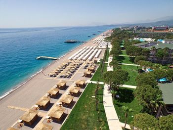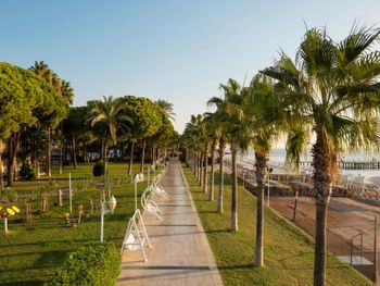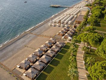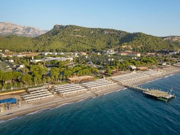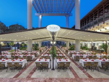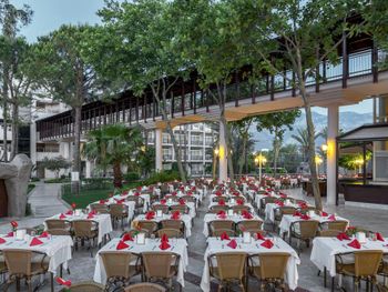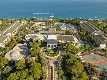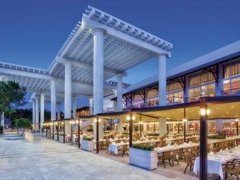 Большая, всегда очень чистая, ухоженная, много зелени, пять ресторанов, три бара в пляжной зоне и ещё несколько на территории. В снек-баре всегда полно еды - рыба, пицца, паста, фрукты, кондитерские. В отдельном ресторанчике готовят гёзлеме, в другом бургеры. Есть Старбакс (крохотный), есть небольшое кафе-кондитерская со столиками в тени деревьев. Всегда можно взять мороженое.