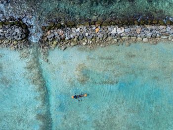 Поплавать можно со стороны главного пирса справа от водных вилл, там достаточно глубоко, даже в отлив, но берите тапочки.