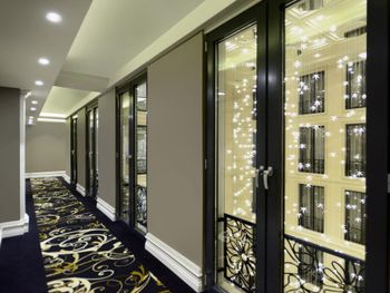 Номер премьер без окон на улицу. Их заменяют стеклянные двери которые выходят на рецепшен и противоположный коридор (откуда просматривается весь номер)
