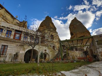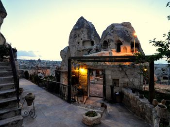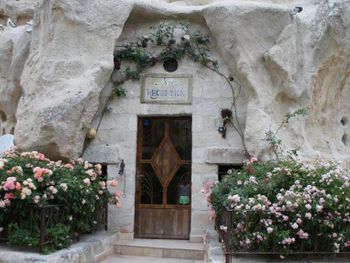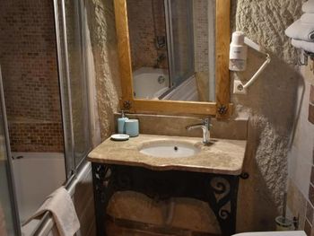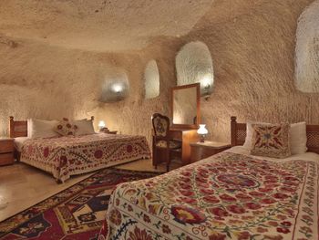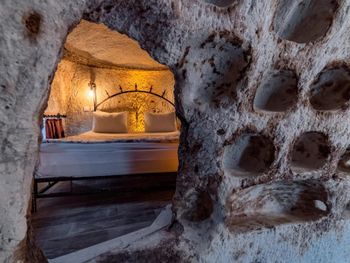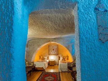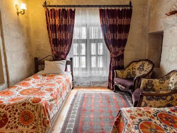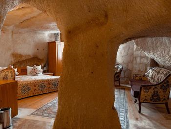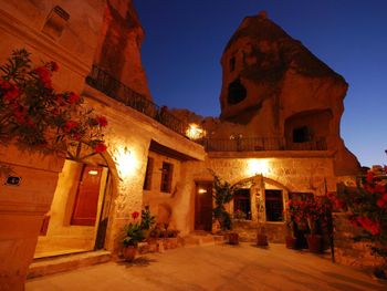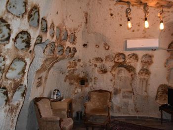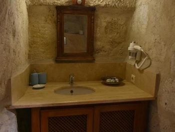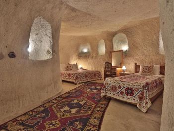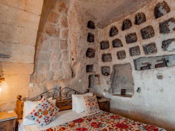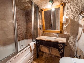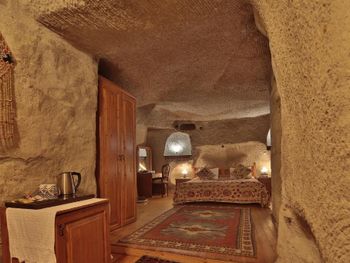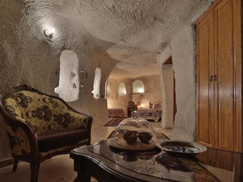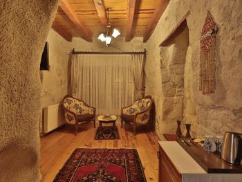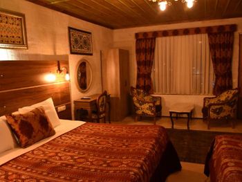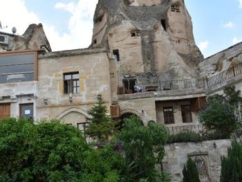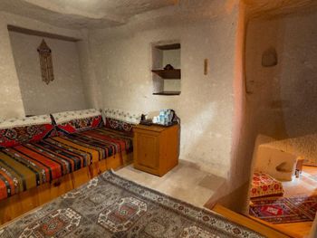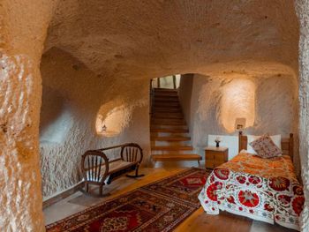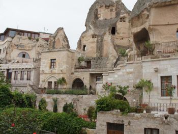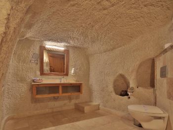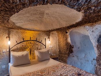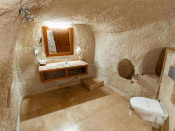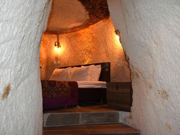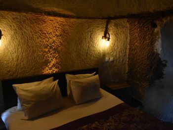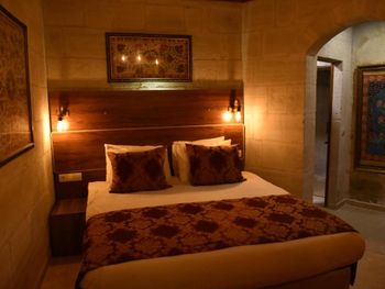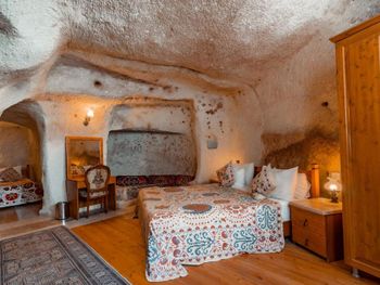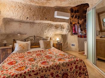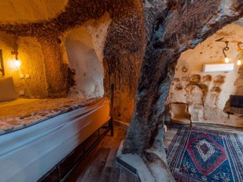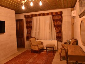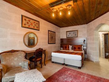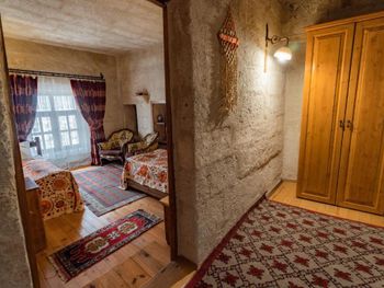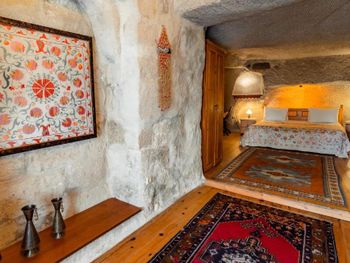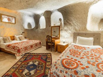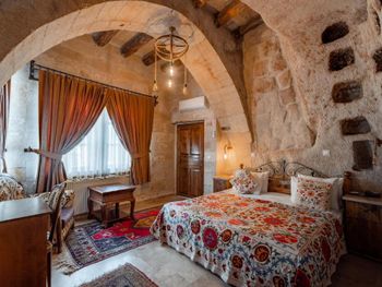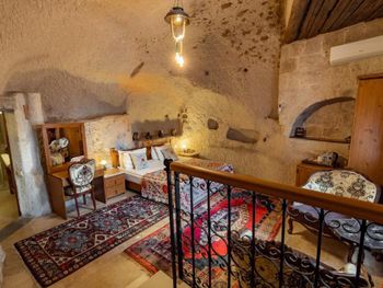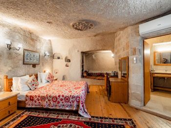 Потрясающий отель с удивительной атмосферой в центре города Гемере, полностью в пещерном стиле, находится на возвышенности, откуда открываются шикарные виды на Каппадокию. King-size кровать, большая ванная комната, 2 комнаты с полным антуражем пещеры, низкие потолки, невысокие проходы,на окнах решётки, за окном скалы...настоящее средневековье! В номере своя терраса с видом на город. Очень аутентично!