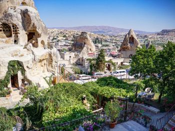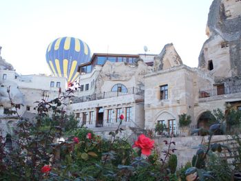 Удобно расположен у подножия горы, с которой можно наблюдать шары, утром далеко идти не надо. С балкончиков номеров чудесный вид на Гёреме!