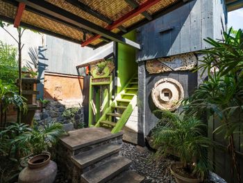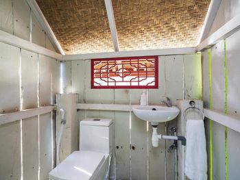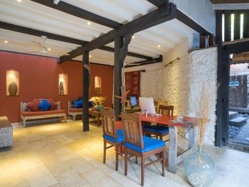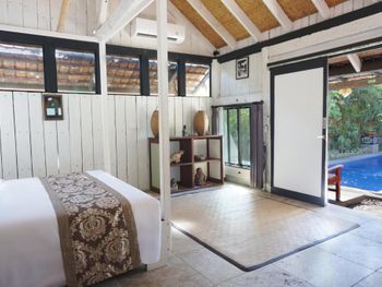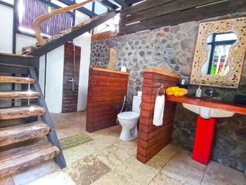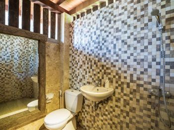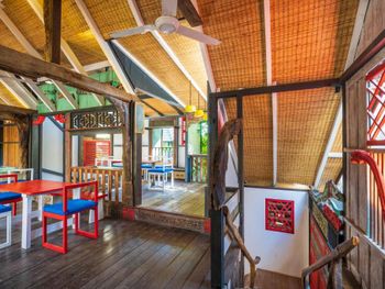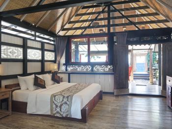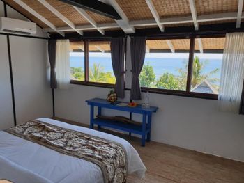 Мы уехали на день раньше. Сам домик сделан из того что попалось под руку, туалетная зона расположена странно, в душ нужно спуститься на этаж ниже. Весь санузел напоминает деревенский туалет в худшем проявлении. Владельцы украсили туалет деревянными элементами, похоже на что-то антикварное, но облезлое и пыльное. Из-за щелей между досками и плетеной крыши в доме жара. Когда трогаешь стены, они прям горячие. Кондиционер и потолочный вентилятор с охлаждением этого всего не справляются, мало того, дует в сторону кровати. Полы чистые, но везде по углам и на элементах декора пыль. По кровати ползали насекомые, по стенам номера внутри лазили гекконы, в последний день на кровати обнаружили их какашки. Сам курорт на мой взгляд не стоит посещения, каменистый пляж, инфраструктуры около отеля особой нет. Вечером делать нечего, если в ближайших кафе никто не выступает.