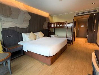 При заселении нам сделали апгрейд до улучшенного номера в качестве подарка без просьбы на это и без доп.доплат 😃это очень приятно!! Оплачивали на месте картой виза (из Беларуси, белгазпромбанк). Взяли депозит 2000 бат, сказали вернул спустя неделю после выселения. Если наличными оплата-то депозит возвращают сразу после выселения. Нас было 2 взрослых и 1 ребенок (4года) и первоначально заказывали номер с двумя раздельными кроватями- в итоге в номере было: 1 огромная кровать+ двухъярусная кровать. Ребенок пищал от удовольствия от двухъярусной кровати. С Болтоном. Вид шикарный- прямо на бассейн детский. В комнате была тарелка фруктов в честь заселения. В номере каждый день по 4 бутылки воды в стекле. Уборка ежедневно, замена палатенец. При заселении была душевая кабина и ванная, зубные щетки, ватные палочки, шапочки для душа, крем для тела, шампунь и гель для душа. Все в пешей доступности- кафе, обменники (середина февраля 2025 курс 33.4$), рестораны, магазины, шопы с weed на каждом шагу за территорией отеля. Пляж шикарный, море шикарное. На берегу делают массаж от 300 бат (курс доллара 33.4). Есть некоторые кафе на пляже, на берегу, с кухней и музыкой , которые работают до 3:30 утра. Души есть с пресной водой везде : возле бассейна , пляжа. Завтраки шикарны: овощи: черри, огурцы, зелени несколько видов , Марковь и другое, соусы, оливковое масло, бальзамическое, супы, йогурты, сыр с голубой плесенью, мед, орехи, семечки, вычечка различная, соки макетированные, молоко, нутелла, сливки взбитые-восторг отдельный). Завтраки 6:00-10:00. Приходили и к 10:00, и к 10:05 всего хватало. Из фруктов на завтраке: ананас, бананы маленькие, арбуз, папайя и что-то еще , манго не было. Манго на пляже или за территорией. Вообщем восторг полнейший. Есть детский клуб рядом с детским бассейном.