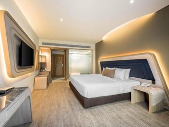 "Делюкс" - вполне светлый номер, кровать комфортная. В душе есть горячая вода. Проблема номера - консоль "Умный дом 80-х". Эта штука пытала нас внезапным световым полтергейстом - каждые 5-8 минут вспыхивал свет в течении всей ночи, самовольно включался и выключался кондиционер на произвольной температуре (эта проблема была не только в нашем номере).
