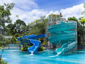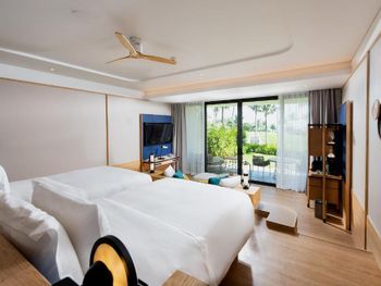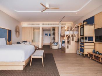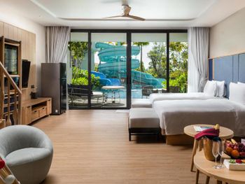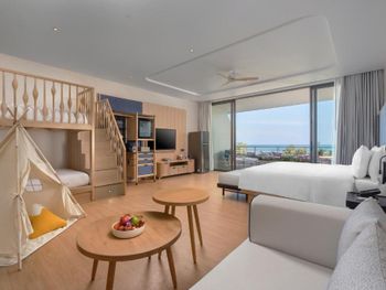 Отель совсем новый. Огромный номер продуманный до мелочей. У нас из номера был выход сразу к бассейну с детскими водными горками. Вода идеальной температуры, можно в аквапарке провести хоть целый день. Большая детская комната с разными развлечениями. Мы еще брали мопед с коляской и прокатились до закатного пляжа. Остров совсем дикий и красивый.