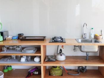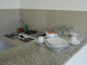 нет пляжа. Море рядом, в выхода нет. Ездили на пляж 5 мин на байке. или 20 мин пешком. Неудобно.