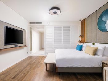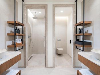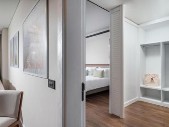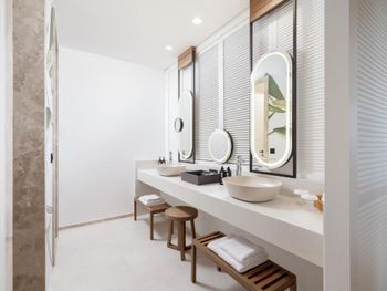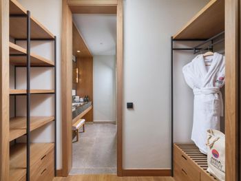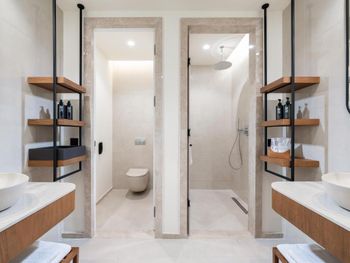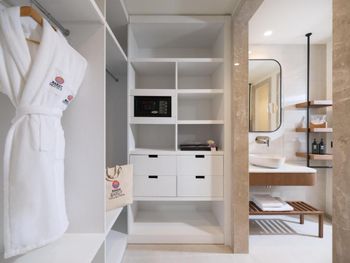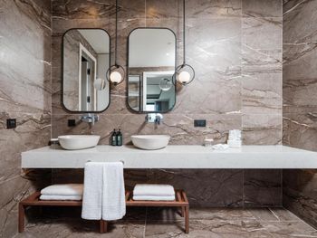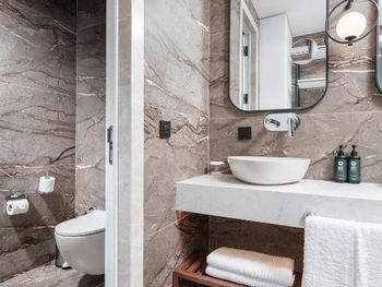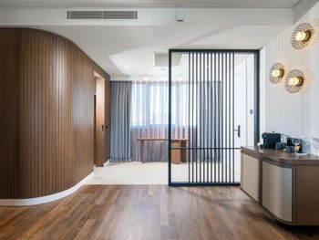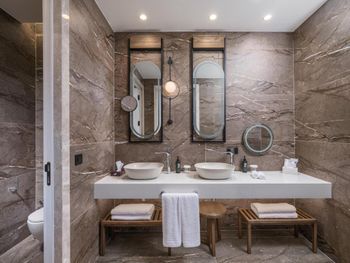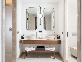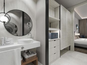 В номере не понравилось только зонирование ванной комнаты: не предусмотрена дверь между коридором и зоной с умывальниками, соответственно шум от бритья или чистки зубов был слышен в жилой зоне, что не очень комфортно при наличии маленького ребенка
