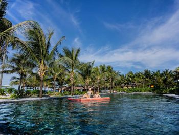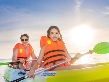 На пляже можно взять сап или каяк для морской прогулки.