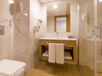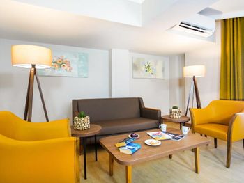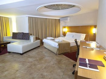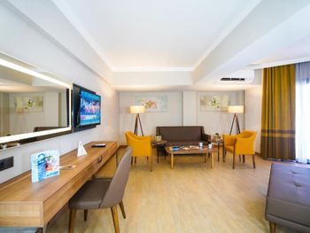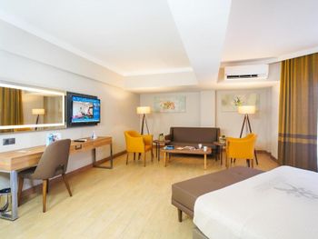 Завтрак по турецким меркам 9 из 10, со сменой блюд, достаточное разнообразие и вообще очень позитивные впечатления. Персонал отзывчивый и учтивый. Многие вопросы удалось решить без проблем. Номер удобный, достаточно просторный. Кровать хорошая. Нет теплого, мягкого одеяла, только один плед на двуспальную кровать. Это конечно минус, но очень плохо. Есть холодильник, удобные шкафы, кондиционер и балкон. В целом номер соответствует ожиданиям. Есть комната для работы и отдыха на первом этаже. Комфортный отель для проживания и работы. Интернет стабильный.