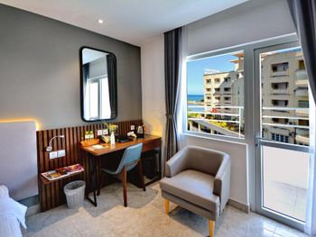 Номер 4101 уставший, балкон убитый, все ржавое, цветы завяли. Скамейки установлены так, что они загораживают обзор. Когда садишься, оказываешься спиной к морю, а что бы увидеть вид как на рекламных фото, надо встать на скамеку и нагнуться вперед. Ресепшн еле нашли, он оказался в тесном кафе в этом же здании. Подозрительный графин с водой вместо 2 бутылок воды. Не было туалетной бумаги и салфеток.