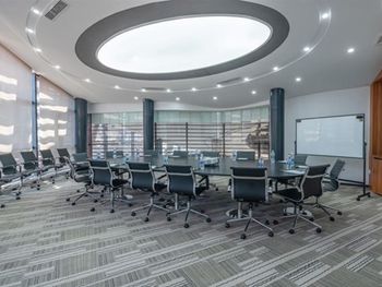 Состоит из главного 3-этажного здания и трех дополнительных 5-этажных зданий, в главном 4 лифта, в дополнительных 6 лифтов.