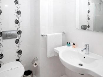 Грязновато, ковровая дорожка в коридоре на 2-м этаже 6-го блока с дыркой и с большим зеленым пятном, сколы на дверях, стенах, отсутствие жидкого мыла в установленных на стенах диспенсерах, нет одноразовой зубной пасты, щетки, волосы на мебели, в момент заселения не было воды (но ее можно взять в ресторане бесплатно) и тек душ, душ отремонтировали (за это спасибо), одноразовые шампунь и гель для душа не очень, но самое главное - платный интернет - (1 день 5 евро, 3 дня 10 евро).