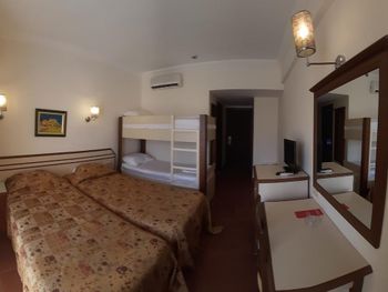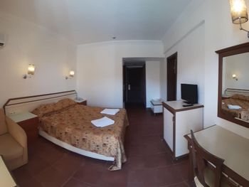 Это конечно не 5* и даже не 4*. Номера на 4 этаже маленькие и неуютные, ванные комнаты тесные, нет биде даже в номерах выше классом. Питание однообразное и не очень вкусное, хотя было бы странно ожидать чего-то другого за те небольшие деньги, которые они берут за "все включено".