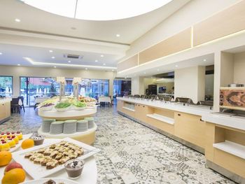 Расположение отеля прекрасное. Рядом центральная улица с магазинами, пляж через дорогу и маленький парк. Питание шикарное. На обед и ужин всегда есть на выбор несколько видов мяса (курица, индейка и даже свинина) и рыба (была красная рыба, дорадо, сибас, сельдь). За неделю один раз были раки и несколько раз мидии. Много салатов, разные виды сыров. Прекрасный выбор сладкого. Фрукты тоже есть. Номера в корпусе "В" после ремонта. Комнаты категории "Стандарт" комфортные и просторные.