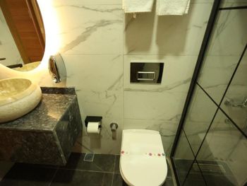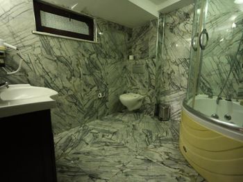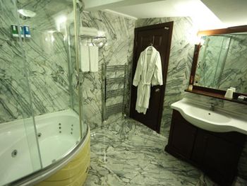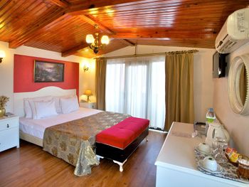 "Люкс с видом на море", который был нами куплен, не люкс и без вида на море. 5 этаж, винтовая лестница. На это не жалуюсь, были предупреждены заранее. Просто надо иметь ввиду. О номере-чердачное помещение с неплохой площадью, порядка 25 кв.м. Все остальное люксом назвать никак нельзя. Опишу подробно, чтобы, выбирая отель, вы могли точно ориентироваться , подходит вам или нет. Для меня информация об отеле, точнее о номере ,оказалась несколько обманчивой . Итак: большая кровать представляет из себя две сдвинутые вместе, сверху матрас и наматрасник, который закрывает только 2/3 матраса)), отчего чувствуется его наличие и это не есть хорошо. Пол-старый ламинат, затертый и в некоторых местах откровенно поднятый, как после залития. Телевизор-аналоговый старый. Плохо показывает турецкое ТВ, что говорить о русском. Тарелки нет. Только для мебели. Чайник на месте. При заезде два чая в пакетах и два кофе 3 в 1 в пакетах, больше не добавляли. Кондиционер работает. Про комнату , пожалуй, все. Да, из вариантов "укрыться" только одно! покрывало и только на одного человека. Муж укрывался ночью "подручными" средствами". Теперь балкон-он есть. Он действительно есть, шириной с мужские плечи, на нем два кресла. Можно пережить. С балкона виден маааааленький кусочек моря между впередистоящими домами. Если это "вид на море", то, можно считать, его нет. Ванна-из плюсов-хорошая площадь, пожалуй все. Заявленная в рекламе джакузи-не джакузи, не работает. Набирать ванну не советую тоже, т.к. через 15 минут вода начинает холоднеть и домываться вы будете водой комнатной температуры. При заезде в ванной: два мыла, 4 шампуня, 3!!! шапочки для душа, пакетик с зубочистками. Зубных щеток и пасты нет, имейте ввиду. Мы покупали в маркете сами. Белье удобоваримое, если бы в полотенцах не было дырок. Ванна сливается плохо от слова совсем. Свет никуда не годится. Читать вечером не вариант. Половина лампочек не работает. Тапочки-только одному!