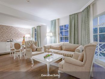 Номер: 46 кв.м, спальня и гостиная (двуспальная кровать и односпальная), балкон, вид на сад, макс.3+1 чел.