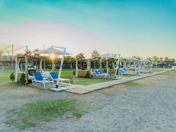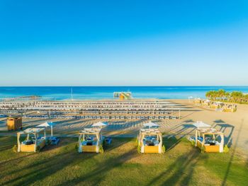 Шезлонги, матрацы, зонтики, пляжные полотенца - бесплатно.