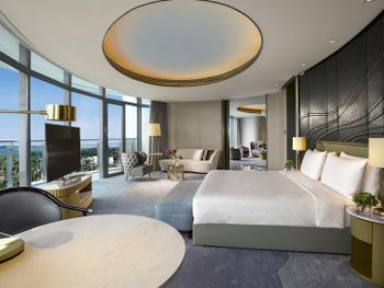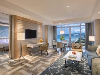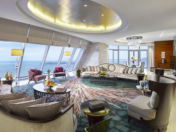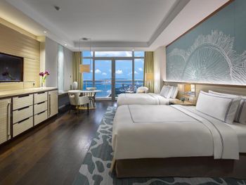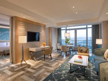 Красивый большой номер Империал на 48 этаже Входил завтрак + 2 ланча, можно полноценно поесть Есть русскоговорящий персонал, очень пииветливы и доброжелательны. По ватсап был на связи Шахзод, отвечал на все вопросы, от него был подарок - 2 мягкие игрушки, очень приятно. Так же принесли в номер тарелку фруктов и фисташки В аквапарке брали фаст трек за 198 юаней, иначе большая трата времени в очередях