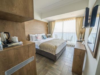 Больше всего порадовал вид с балкона! Море и горы, что может быть прекрасней? Отель действительно пляжный, имеет собственный пляж. Порадовало то, что возле отеля есть парковочные места для постояльцев (мы путешествовали на машине). Обратите внимание на то, что мини-бар в номере платный.