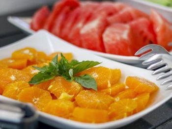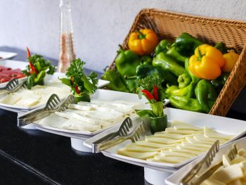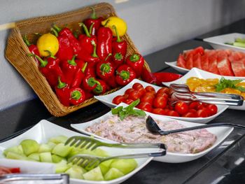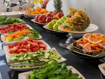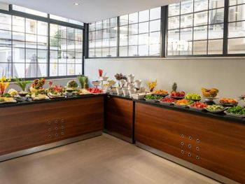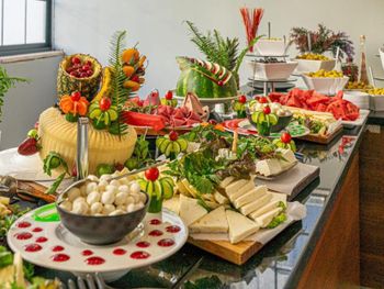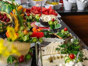 Чудесный завтрак. Большой выбор свежих фруктов, овощей, сыров, маслин, варенья и пр.
