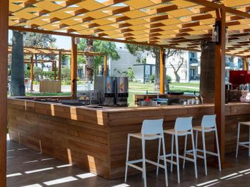 неудобный пляж, ледяная вода в бассейнах, мало зонтов. грязная посуда во всех ресторанах!плохо мыли.