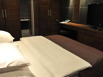 Хотелось бы, чтобы в номере был чайник. Также не хватает розеток рядом с прикроватными тумбочками, их по две с каждой стороны, но к ним подключены лампы.
