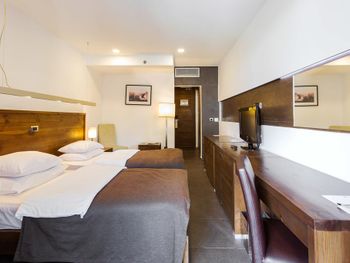 Номера уставшие и на мой взгляд давно требуют ремонта. Оооооооооочень медленный лифт начинает бесить после второй поездки на нем, иногда просто предпочитали ходить по лестнице ))) Еда есть на любой вкус но весьма однообразная. В крытом бассейне слишком много хлорки, в хамаме подванивает, финская сауна холодная. В общем-то это объясняет столь низкую цену за такой крутой отель, но администрации есть над чем работать. При заселении персонал настойчиво предлагал повысить категорию номера, но мы отказались т.к. вид с балкона маленького и дешевого номера на 6 этаже оказался лучше чем в предлагаемом люксе на 1 этаже. При выселении пытались развести на какой-то напиток из мини бара - будьте внимательны.