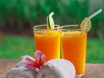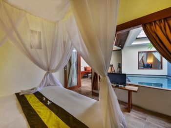 Виллы открытой планировки с деревянным полом располагают гостиной и обеденной зоной, из которых можно выйти к собственному бассейну и в сад. В гостиной зоне установлен диван и телевизор с плоским экраном и кабельными каналами. Кухня оснащена плитой и холодильником. Осуществляется доставка еды и напитков в номер.