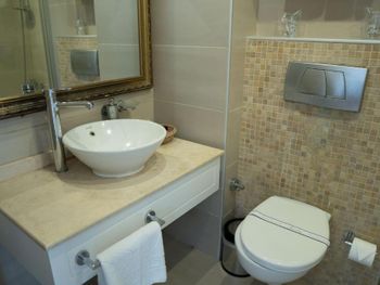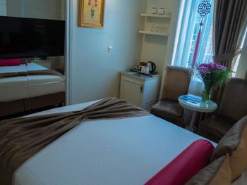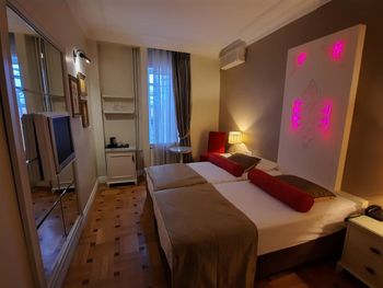 Если бы не минусы ,тогда меньше оценивались плюсы . Хорошее расположение отеля ,спустился влево от выхода из отеля -к набережной ,пройтись вверх -площадь Султанахмет. Главное не соблазняйтесь на рестик под названием AKBIYIK FISH AND MEAT ,он чуть выше ,справа от отеля ))Первое это кухня -до блевоты ,рили..второе так это нагло обманывают ,есть ещё более русское слово вместо «обманывают « ,знающие поймут ) Приносят примочки эти ,закуски как в отелях анталиевских ,мазючки .. якобы угощения от шефа ,пока вы ждёте .. а потом они оказываются на столе ,тебя не спрашивают ,просто приносят и кладут ,ешь ты их или нет ,твоё дело ,все равно идут потом в счёт баксов за 10-15$))заказали там Дорадо ,креветки ,»стейк» и какой то гарнир ,оставили 100$ ниче не поели ,ибо невозможно вонючее ,жирное ,причём в масле таком повидавшем уже )))не хочу продолжать ,во избежание приключений сейчас . А ,там прям через стенку от отеля ,справа тоже завдшка,что касается мяса ,лучше не заказывать,скормила кошкам ) и аккуратнее с этими их шоу с глиняными кувшинами ,мне прилетел кусок раскалённой глины в лицо ..Ладно ,много чего можно рассказать ,но и так сами все увидите ) В отеле весело было ,первую ночь там бухие бабы ,не русские ,орали что то ,потом пели ,танцевали ..а там жешь полы деревянные ,нормальные спецэффекты) вторую ночь какую то бабу драли ,мы все так поняли ,что ей все понравилось )) Номер малюсенький ,старенький ,полуразваленный ,Кровать где-то 140/200 ,стены будто из картона ,мы были на первом этаже ,вида особо не было с балкона ,но в целом гуд . Завтраки не знаю что и как ,фрукты ,чай,кофе вкусно . Остальное не пробовала . Поднялись на террасу,вид классный ,еду так и не поела от того ,что и там обманули .
