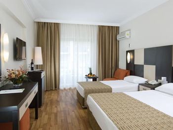 Светлые номера отеля Aydinbey со вкусом оформлены в теплых тонах. Все они оснащены телевизором, кондиционером и мини-баром.